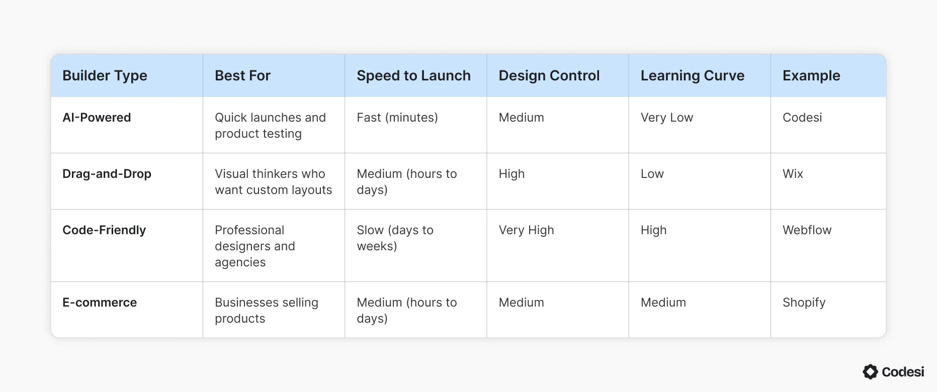 - Design control vs. speed: Every builder makes you choose between customization and launch speed, with drag-and-drop builders sitting in the middle. AI generators launch quickly with limited design options, while code-friendly platforms offer complete control but require the most time.