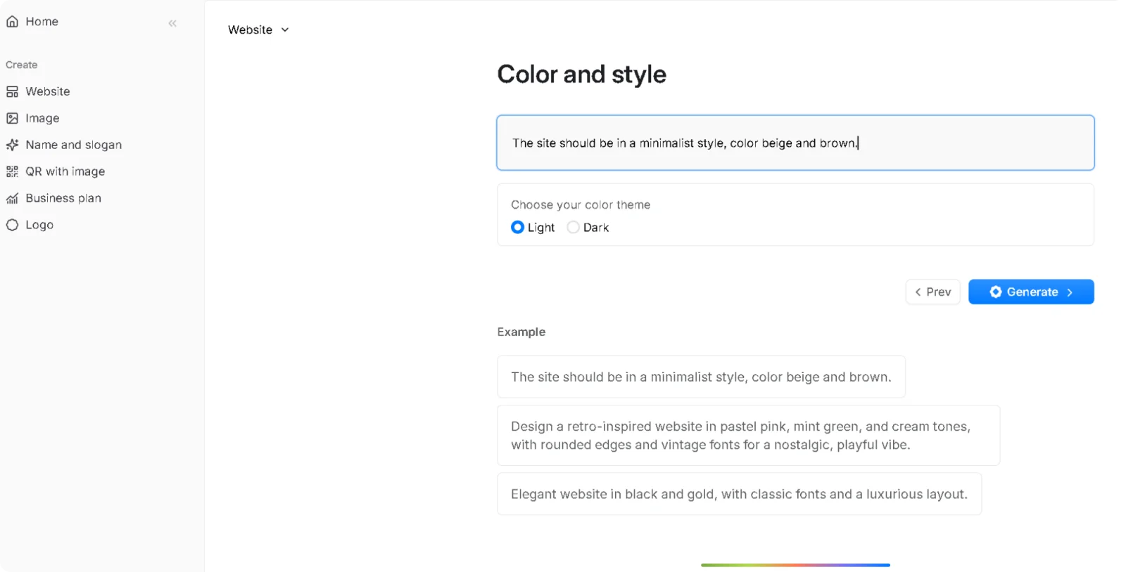 Step 4: Describe your desired visual approach, brand personality, and color theme, then click "Generate".