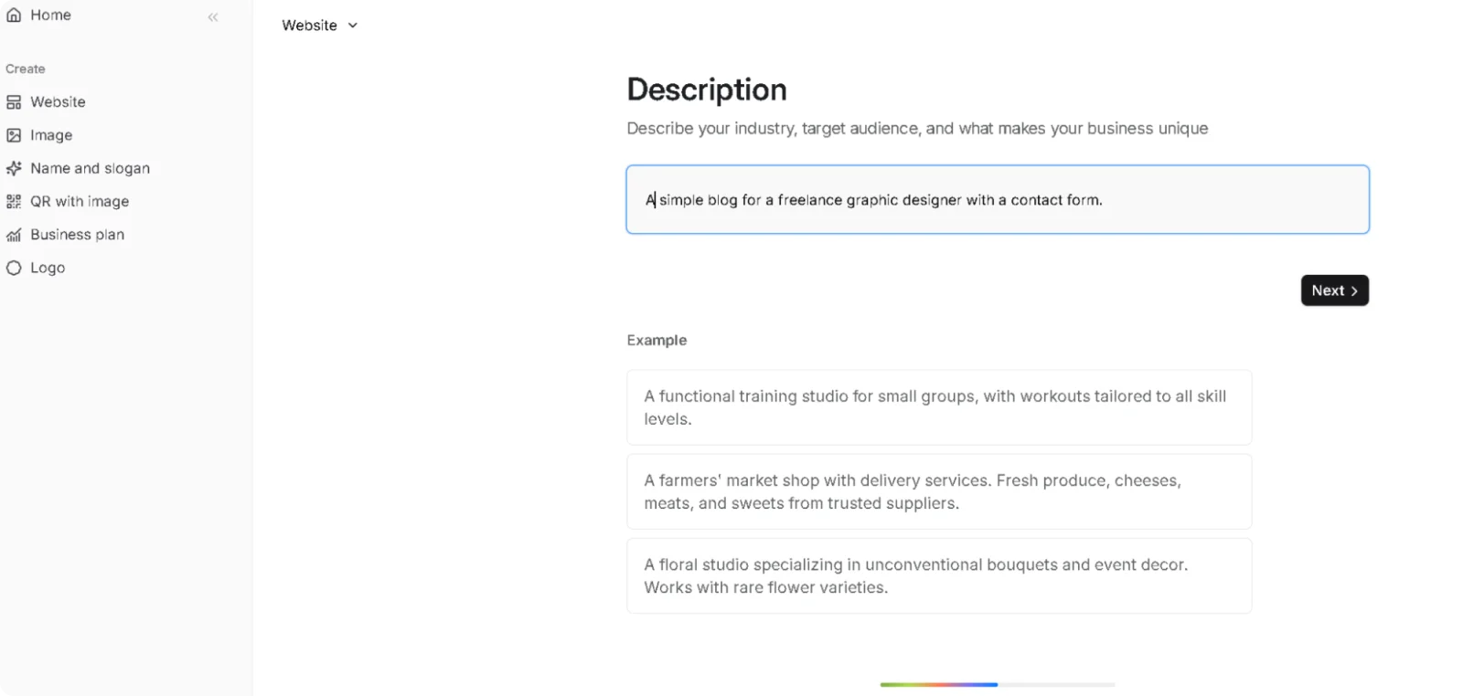 Step 3: Describe what your business does, who you serve, and key features needed, and click "next".