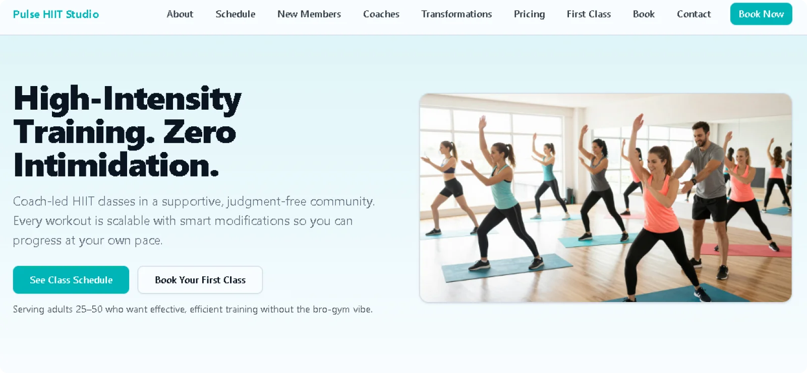Fitness studio offering high-intensity interval training in a supportive community. We serve people ages 25–50 who are intimidated by traditional gyms and want effective workouts with modifications. Include class schedule with intensity levels, new member offers, coach bios, member transformations, pricing options, first-class expectations, and online booking.
