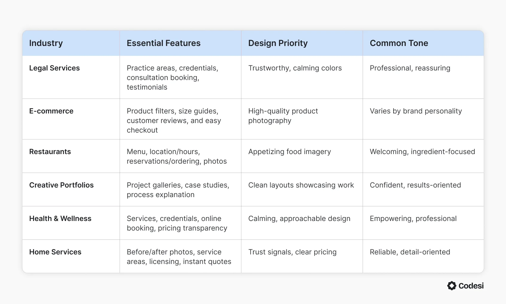 Understanding what each industry needs helps you customize these templates for your specific business. Use this table to identify which elements matter most for your industry, then apply those ideas when adapting the prompts below: